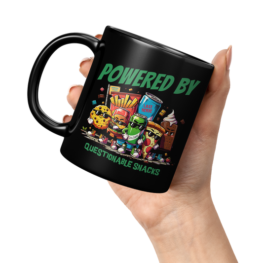 Powered By Questionable Snacks Black Mug, Funny, Sarcasm, Adventure Gift, Adventure Racing Gift