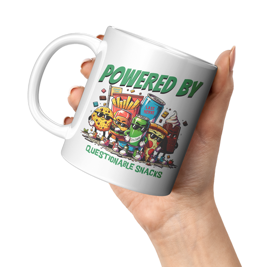 Powered By Questionable Snacks White Mug, Funny, Sarcasm, Adventure Gift, Adventure Racing Gift